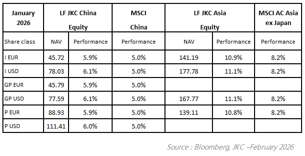 La valeur nette d’inventaire par action de La Française JKC Asia Equity a augmenté de 11.1% en janvier, tandis que l’indice MSCI Asia ex-Japan gagnait 8.2%.